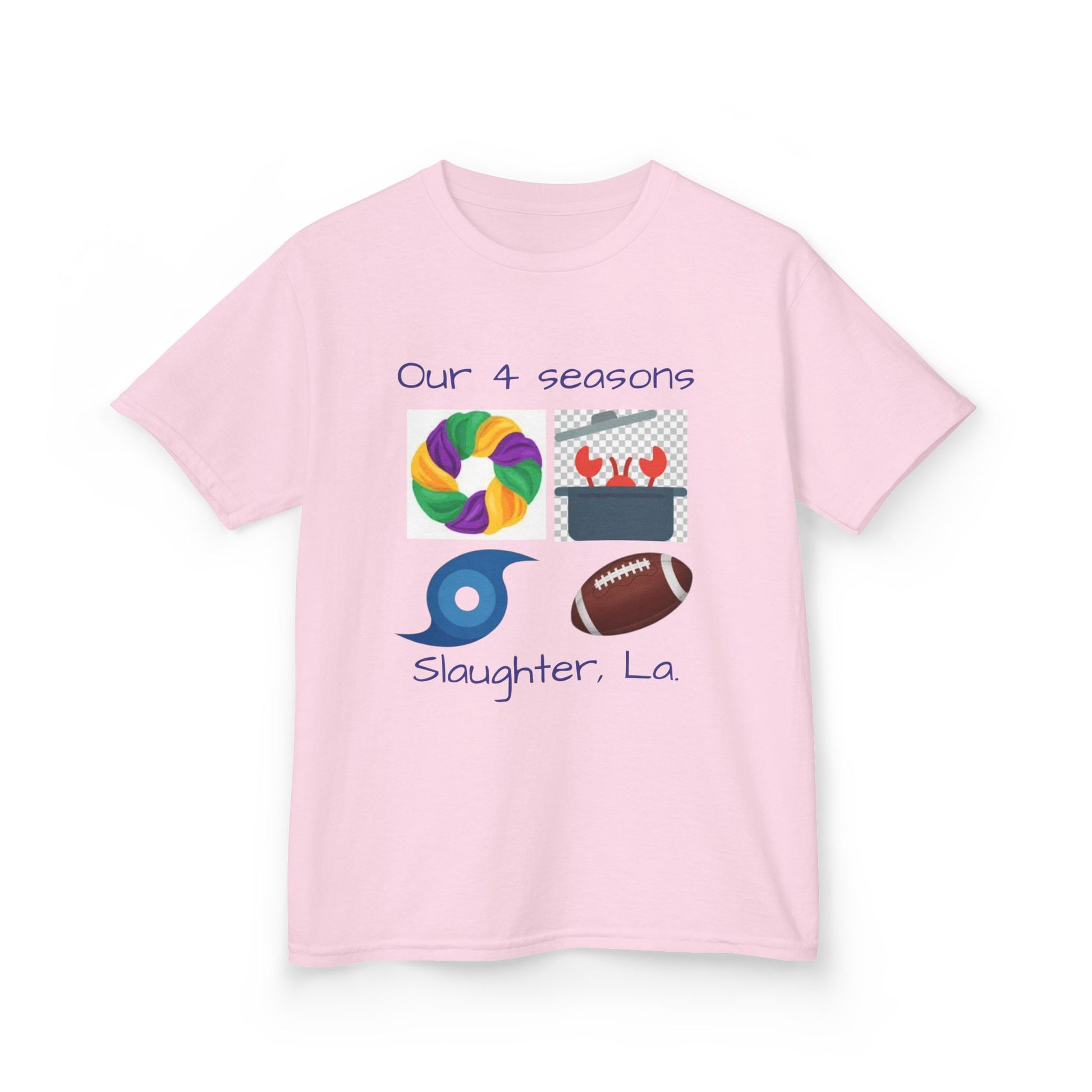 Introducing a T-Shirt that combines comfort with stylish design. This lightweight tee is made from 100% ring-spun cotton, ensuring a soft touch that feels amazing against your skin. The classic fit with a crew neckline makes it suitable for any occasion, whether you’re dressing up for a casual day out or lounging at home. Are you familiar with the four seasons we have in Slaughter & all of South Louisiana? They are kingcake/mardi gras season, crawfish season, hurricane season & football season--GEAUX TIGERS & SAINTS!!