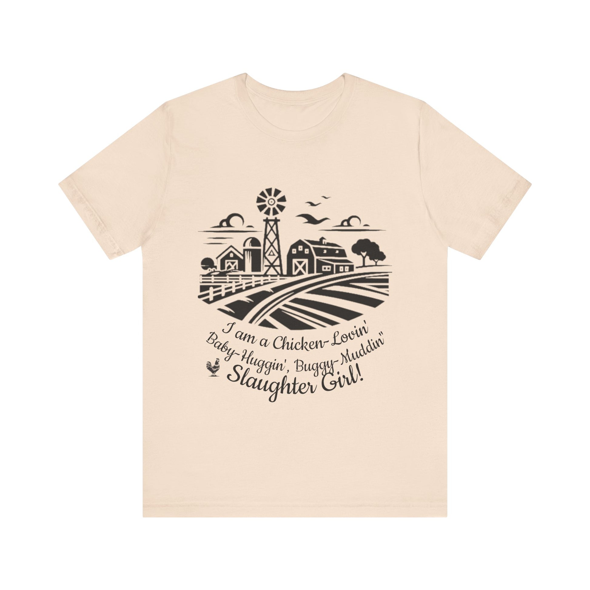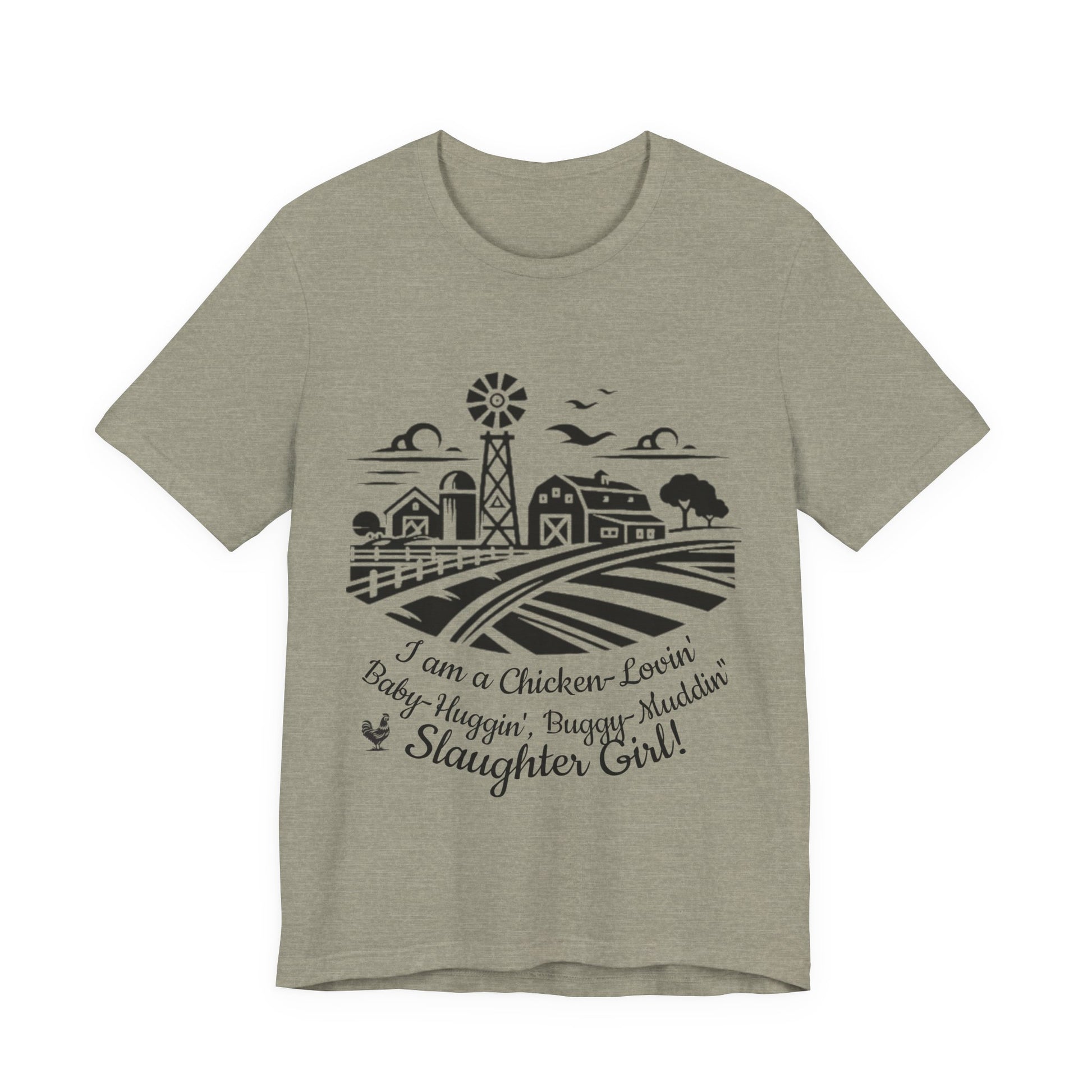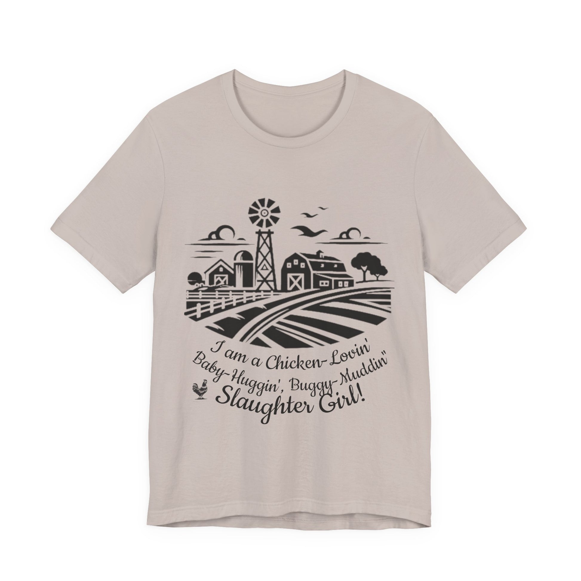Introducing our Jersey Short Sleeve Tee, a perfect blend of comfort and style. Made with 100% Airlume combed and ring-spun cotton, this lightweight tee exudes casual elegance that fits seamlessly into your everyday wardrobe. If you love chickens, babies & riding in the mud this tee is ideal for you! Show your chicken-lovin, baby huggin, buggy muddin Slaughter girl pride!!