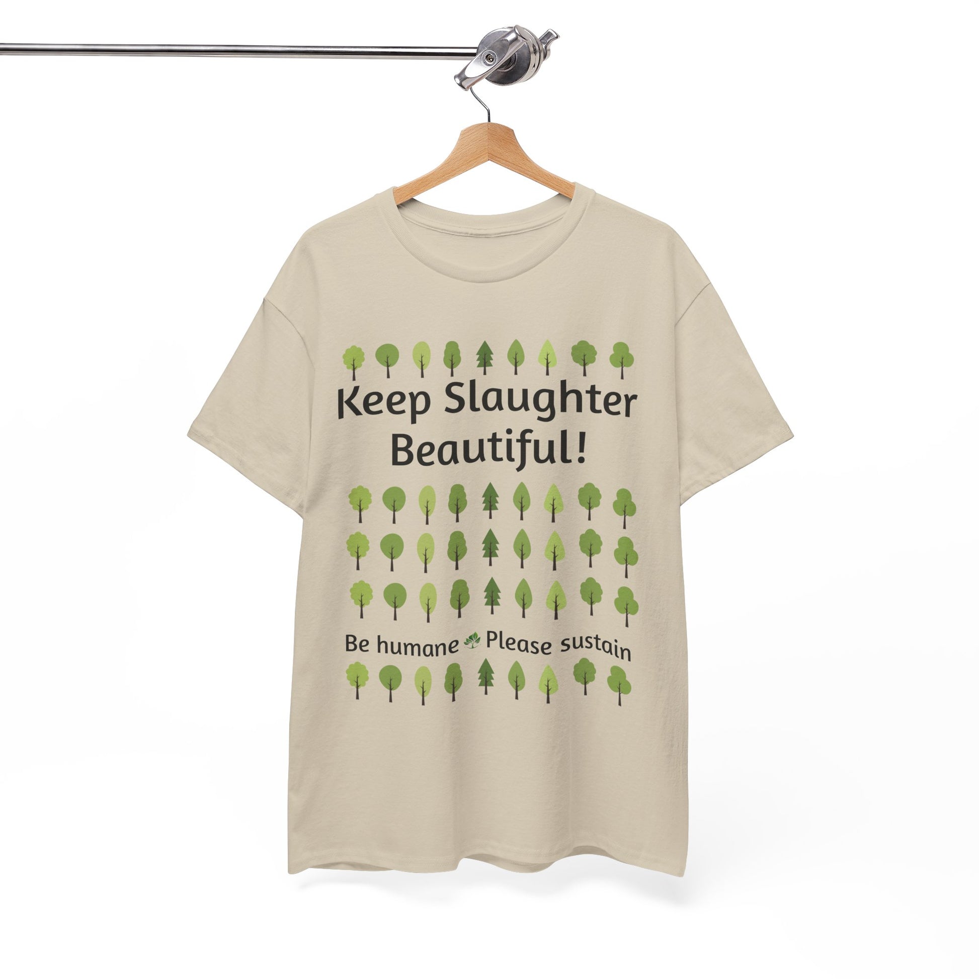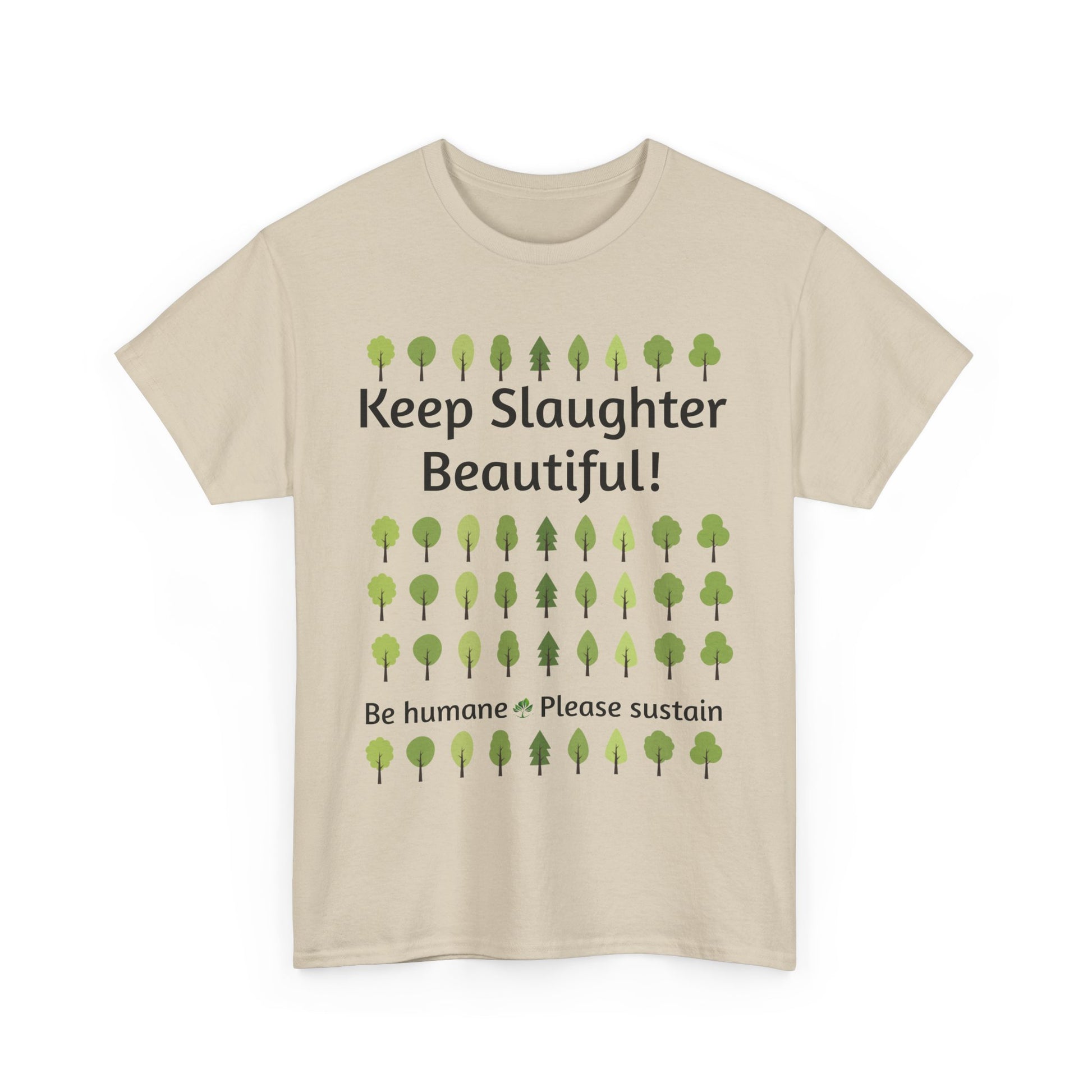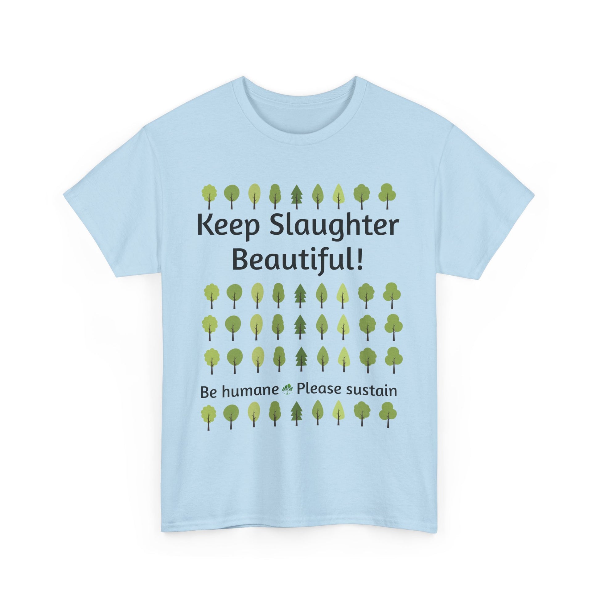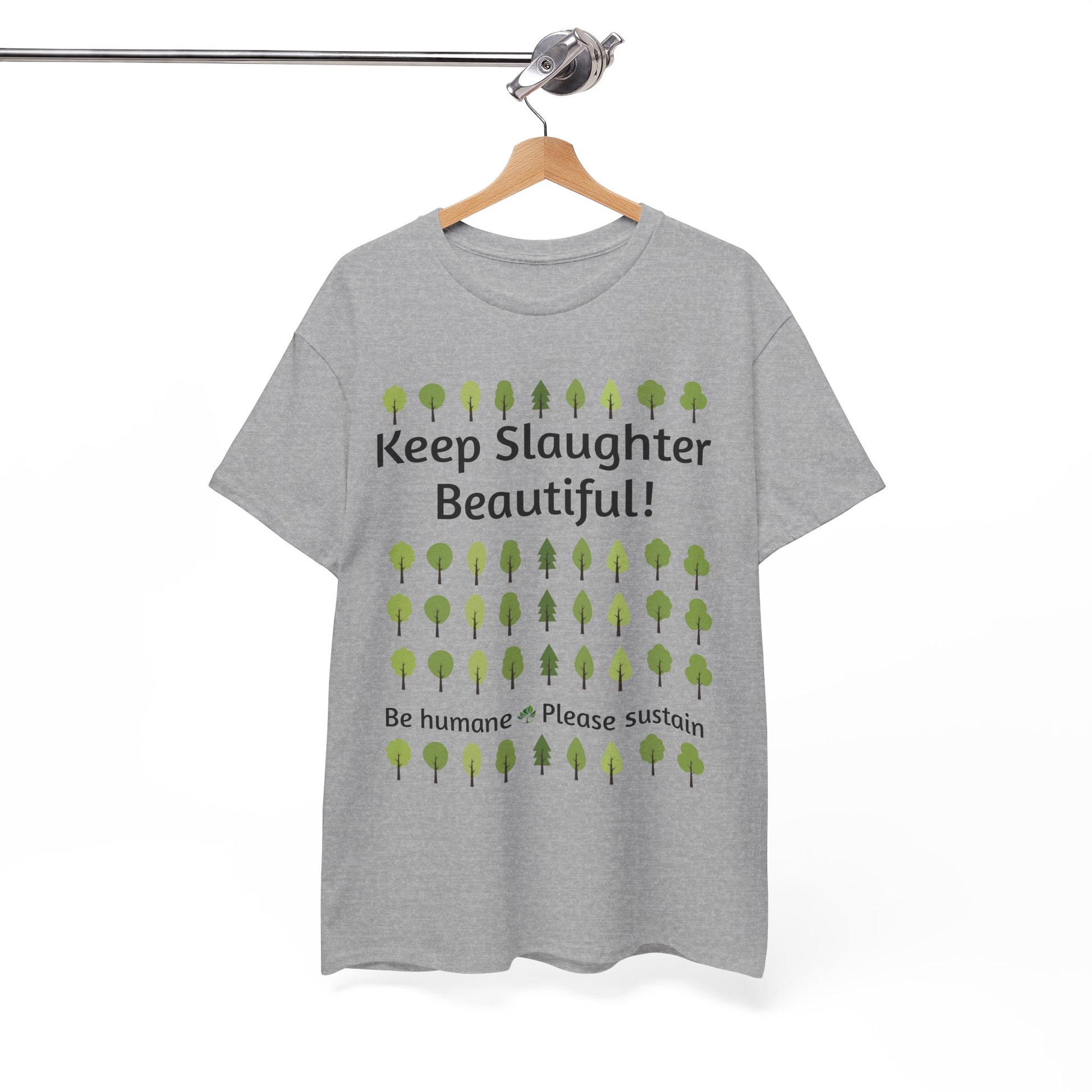 Embrace comfort and style with this Unisex Heavy Cotton Tee, perfect for everyday wear. Its soft, smooth fabric feels fabulous against the skin, making it a staple in any wardrobe. Ideal for casual outings or semi-formal occasions, this tee effortlessly elevates your look while sending a positive message. Great for those who value sustainability and companion, it’s a thoughtful gift for eco-conscious friends and family. Perfect for Earth Day, fundraisers, or simply as a way to express your values. Wear it with pride and join a community that cares! Show everyone you willdo your part to "Keep Slaughter Beautiful"! Also, be humane. please sustain!