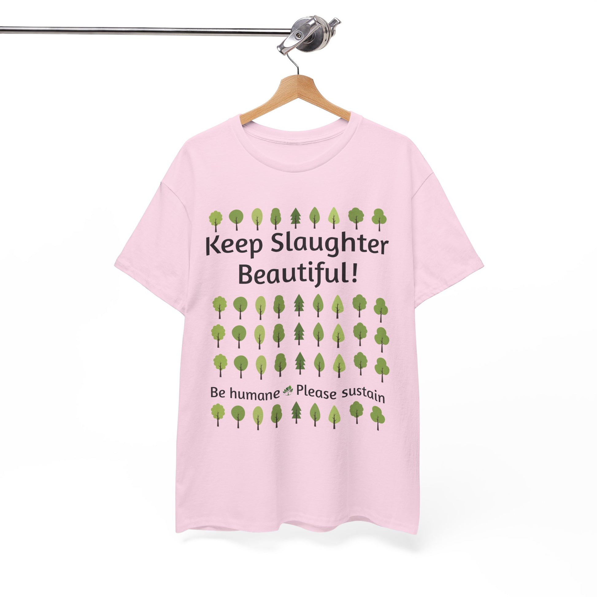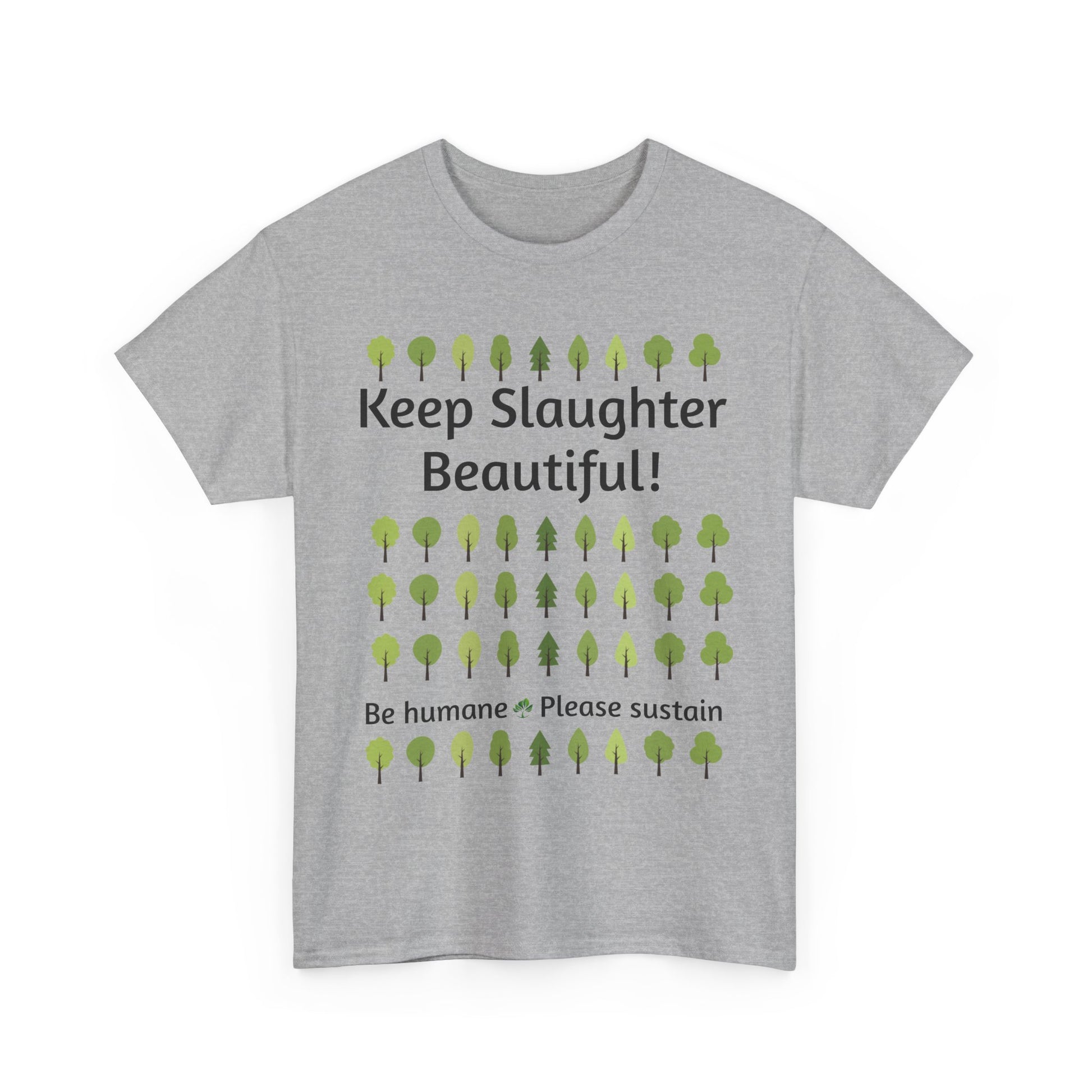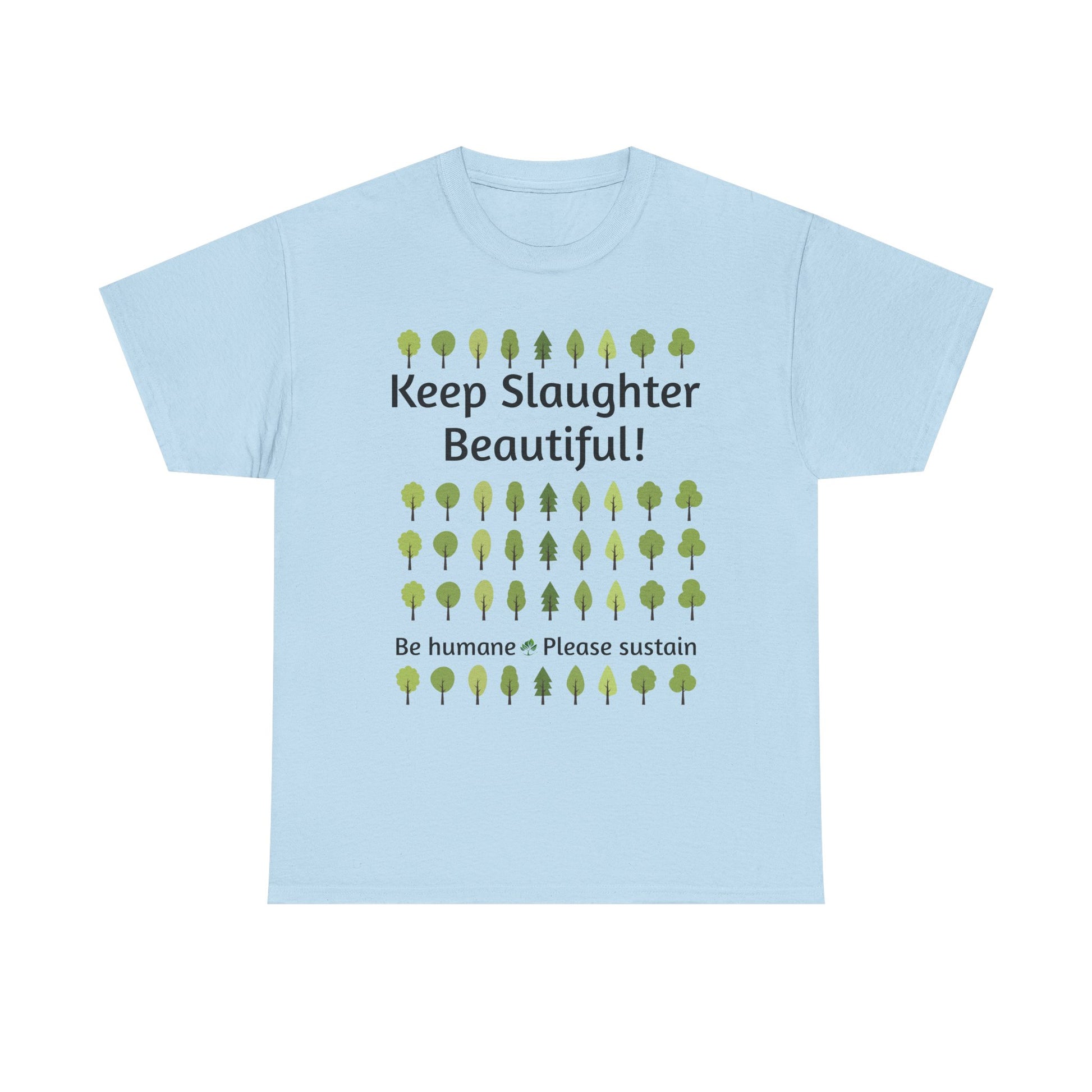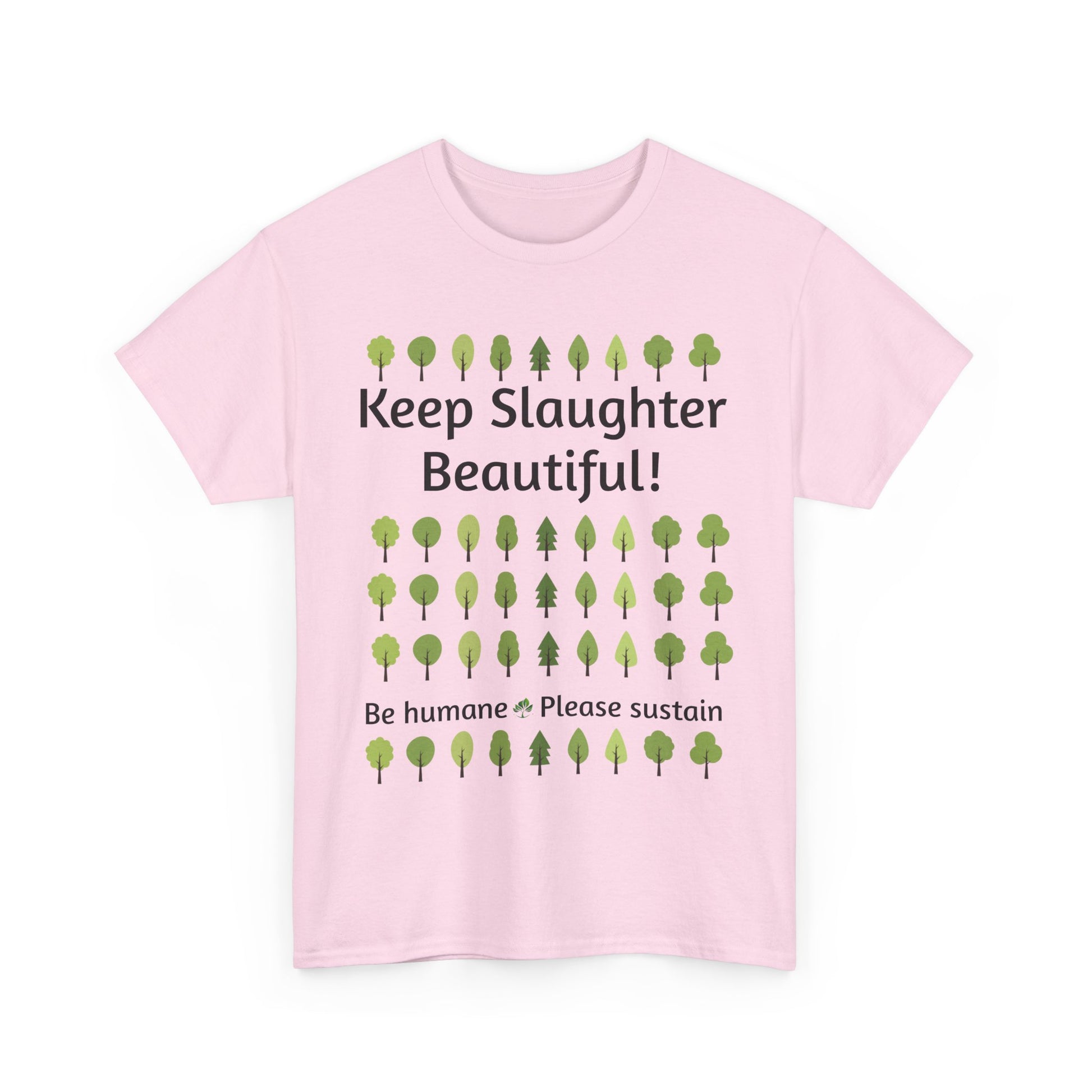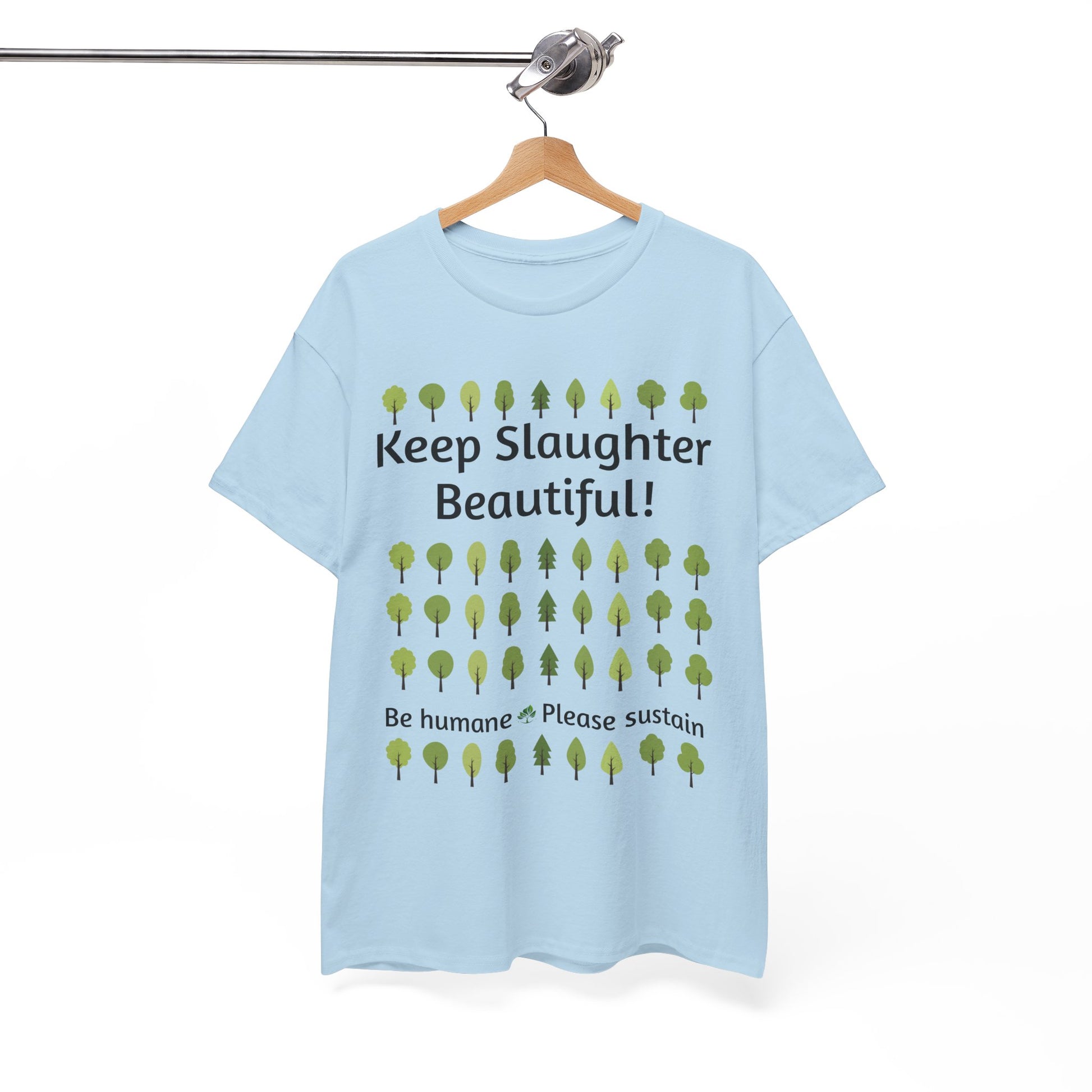 Embrace comfort and style with this Unisex Heavy Cotton Tee, perfect for everyday wear. Its soft, smooth fabric feels fabulous against the skin, making it a staple in any wardrobe. Ideal for casual outings or semi-formal occasions, this tee effortlessly elevates your look while sending a positive message. Great for those who value sustainability and companion, it’s a thoughtful gift for eco-conscious friends and family. Perfect for Earth Day, fundraisers, or simply as a way to express your values. Wear it with pride and join a community that cares! Show everyone you willdo your part to "Keep Slaughter Beautiful"! Also, be humane. please sustain!