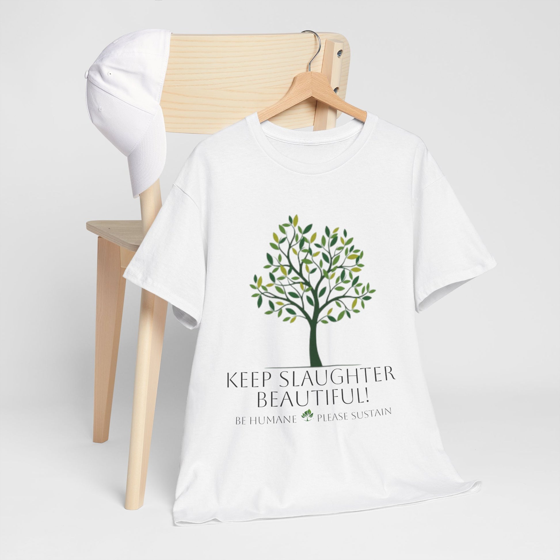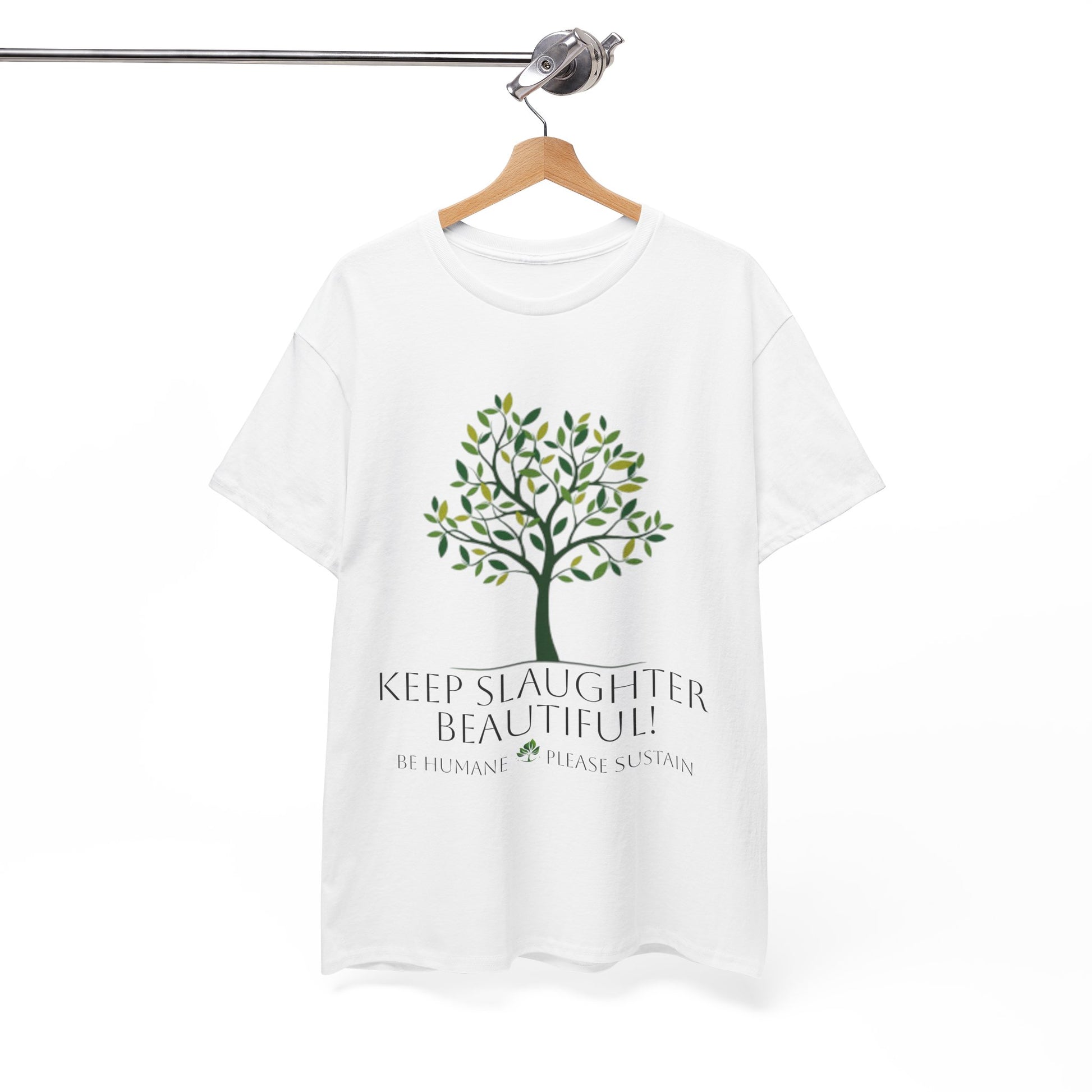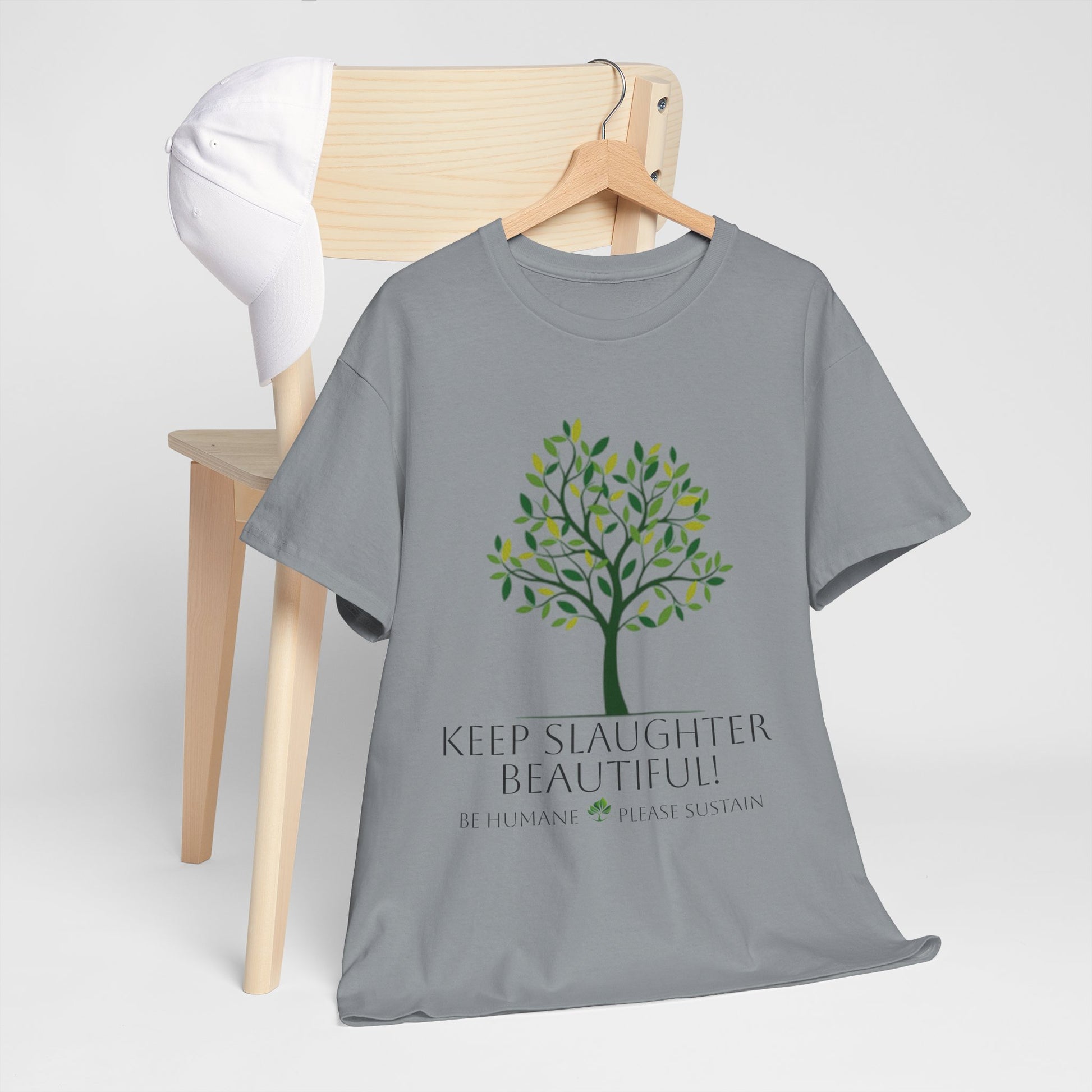 Introducing our Unisex Heavy Cotton Tee, a soft and durable choice for everyday wear. This tee offers a classic fit that’s perfect for both casual outings and semi-formal events. Its comfortable feel makes it ideal for lounging at home or for a day out with friends. The sweet slogan, 'Keep Slaughter Beautiful!', adds a touch of je ne sais quoi, making it a conversation starter. This tee is great for environmentally conscious individuals who appreciate casual style with a message. Perfect for Earth Day celebrations, casual gatherings, or as a thoughtful gift for someone who enjoys unique and meaningful clothing.
