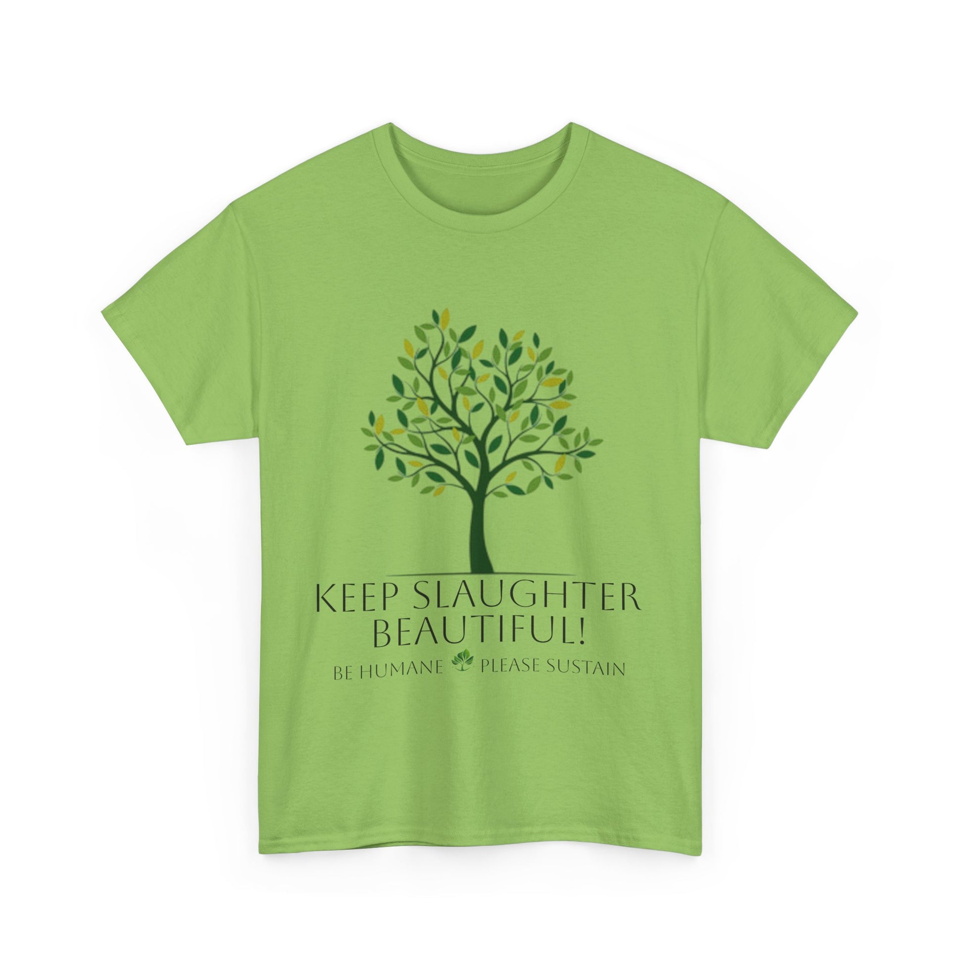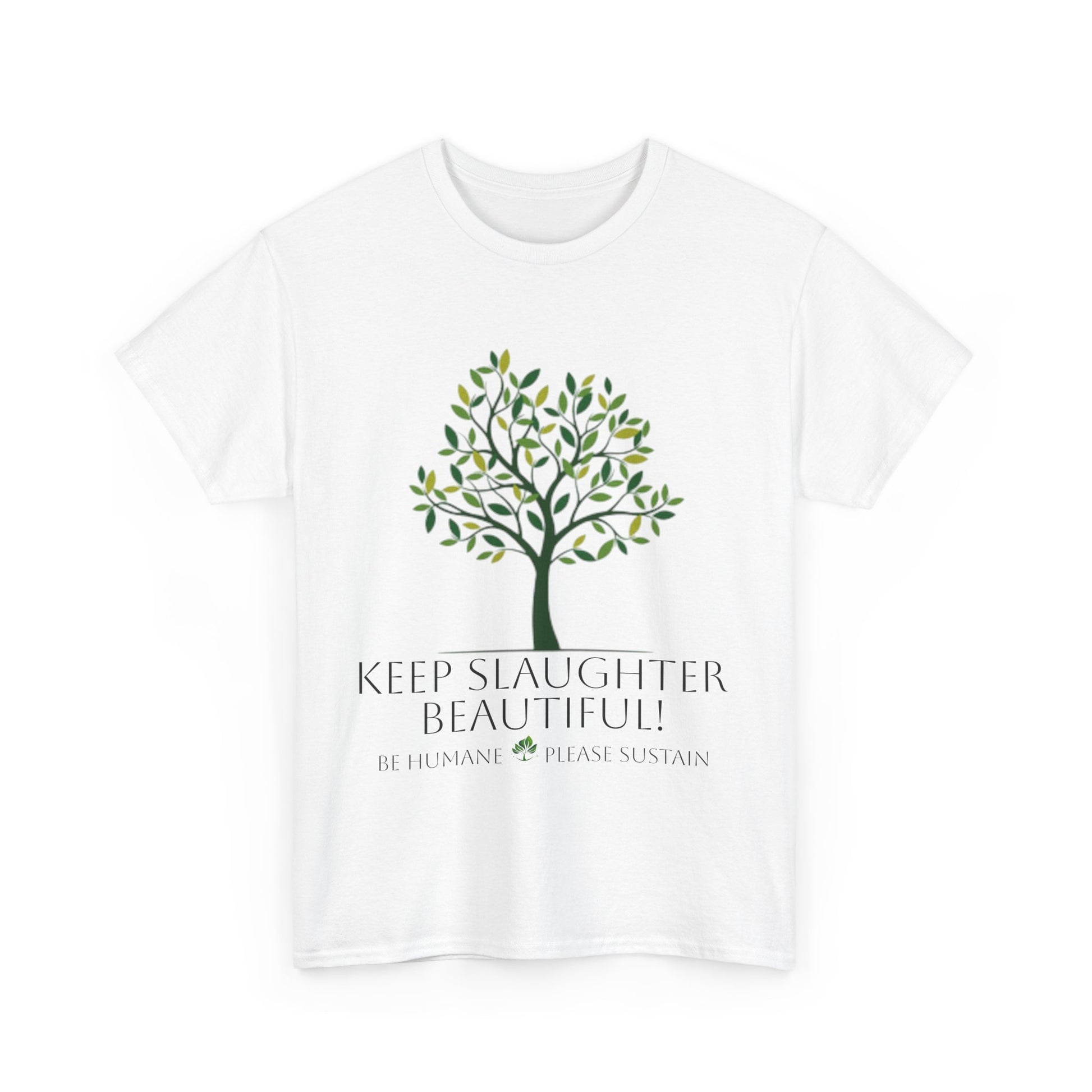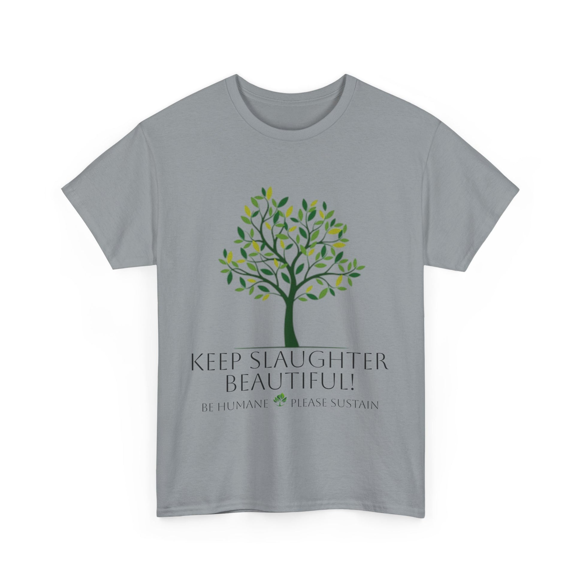 Introducing our Unisex Heavy Cotton Tee, a soft and durable choice for everyday wear. This tee offers a classic fit that’s perfect for both casual outings and semi-formal events. Its comfortable feel makes it ideal for lounging at home or for a day out with friends. The sweet slogan, 'Keep Slaughter Beautiful!', adds a touch of je ne sais quoi, making it a conversation starter. This tee is great for environmentally conscious individuals who appreciate casual style with a message. Perfect for Earth Day celebrations, casual gatherings, or as a thoughtful gift for someone who enjoys unique and meaningful clothing.