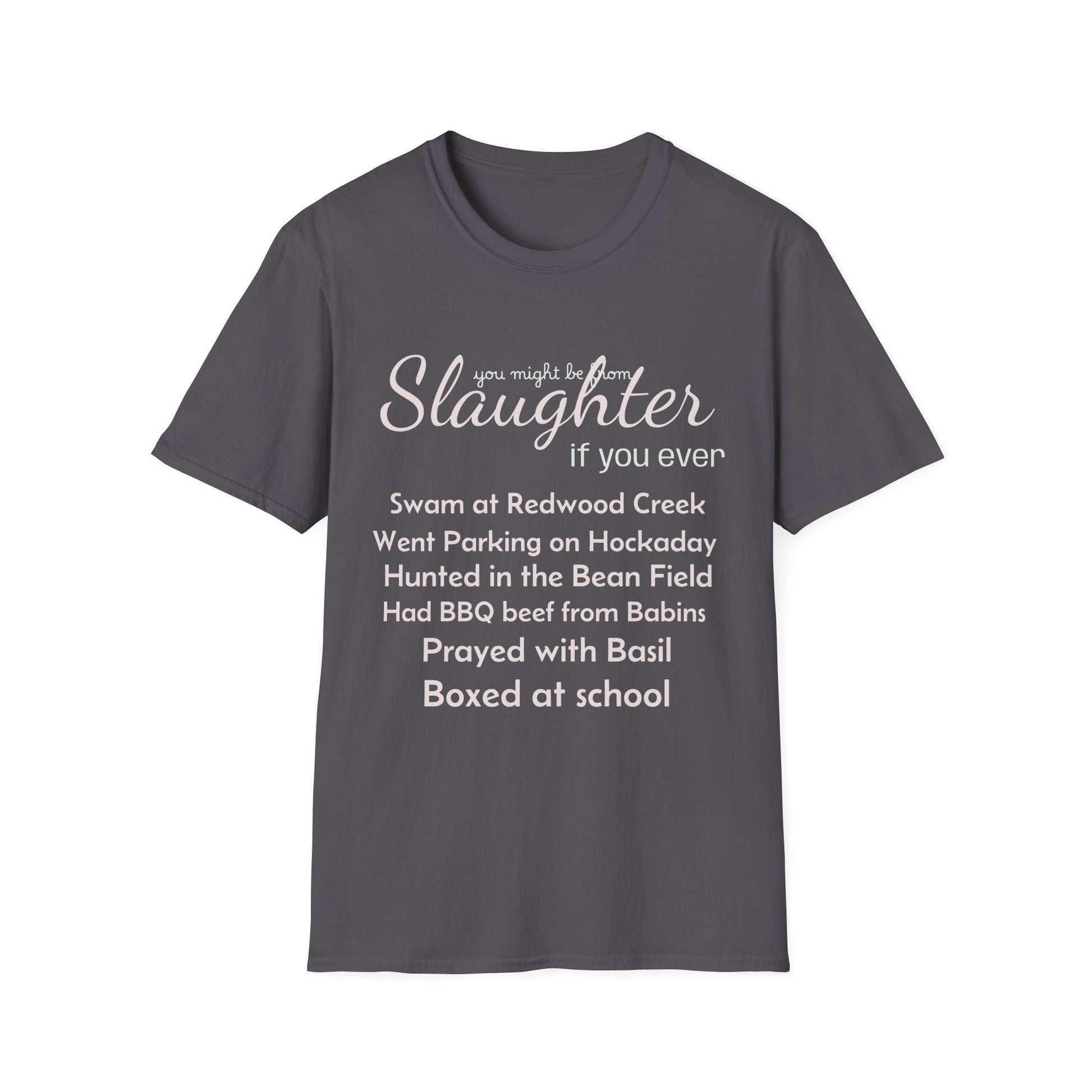 How many of these things haveyou done in Slaughter? Take a walk down memory Lane with this Tee that combines comfort with style. This tee is perfect for casual outings or relaxed gatherings. Its lightweight and soft fabric makes it an ideal choice for everyday wear, providing a laid-back vibe that is both stylish and inviting. Whether you're heading out with friends or just lounging at home, this tee complements any occasion.