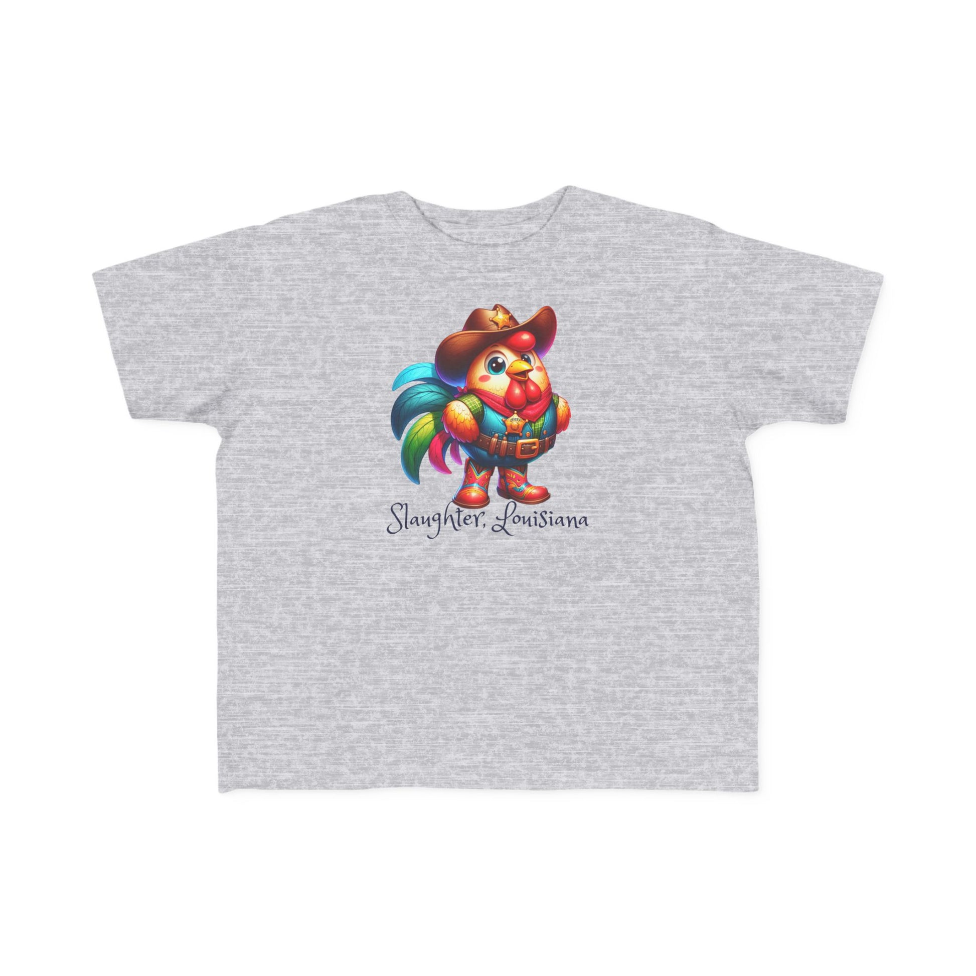Adorable toddler's T-Shirt featuring a cute chicken wearing boots design & designated Slaughter, LA. Made of soft cotton, perfect for little boys to wear. This t-shirt gives a fun and playful vibe, ideal for casual occasions and everyday wear.