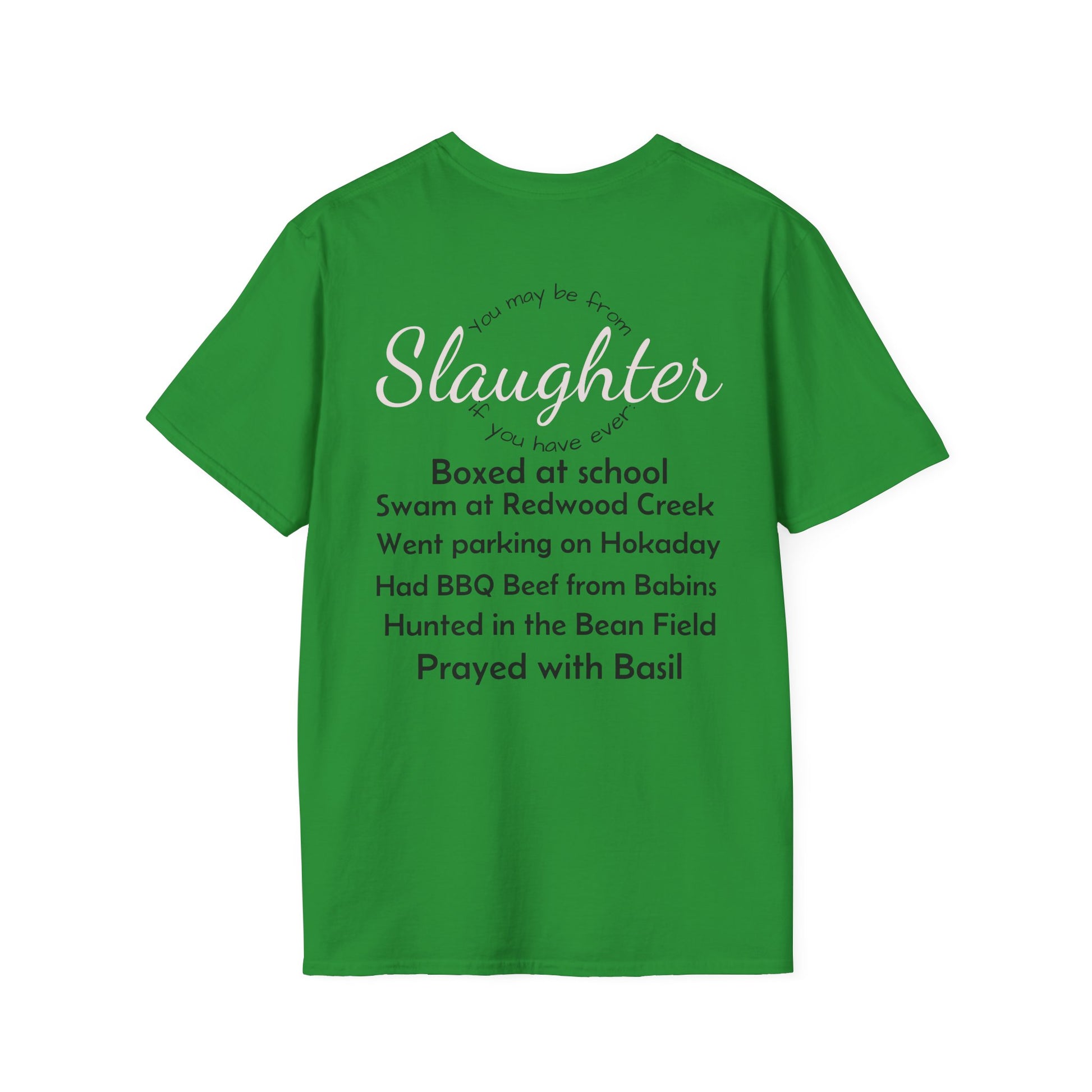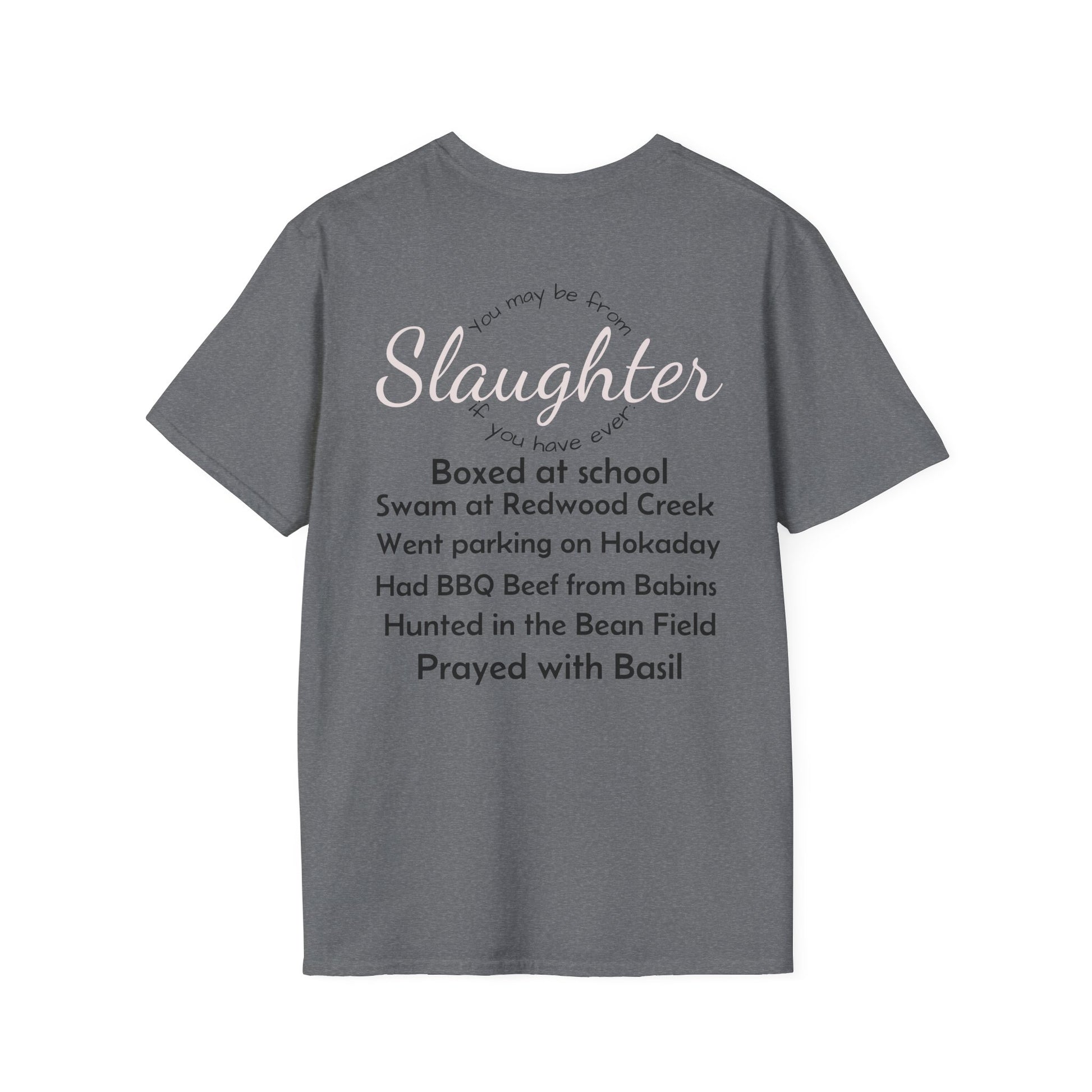 Take a walk through your childhood memories of Slaughter. Do you remember these things? How many sound familiar? Along with this softstyle shirt, these funny characterisitics of Slaughter put a new spin on casual & comfort. Made from very soft materials, this tee is 100% cotton and does not have any side seams and as a bonus it was made using ethically grown and harvested US cotton with sustainable means of production. So wear your Slaughter memories in guilt-free comfort. Design is placed on the back of the tee. please see Women's Tees or Men's Tees for front placement of similar design.