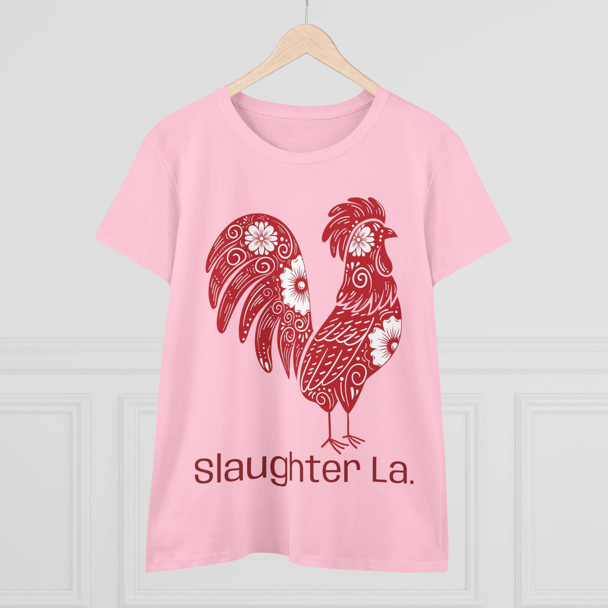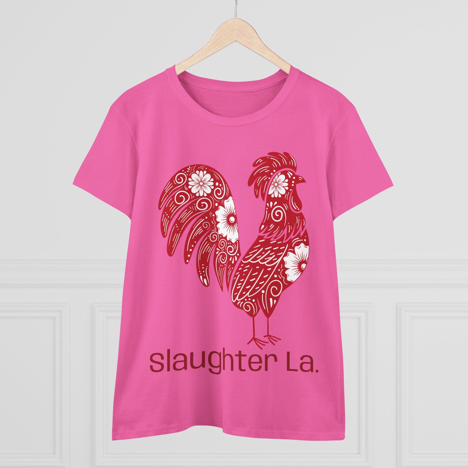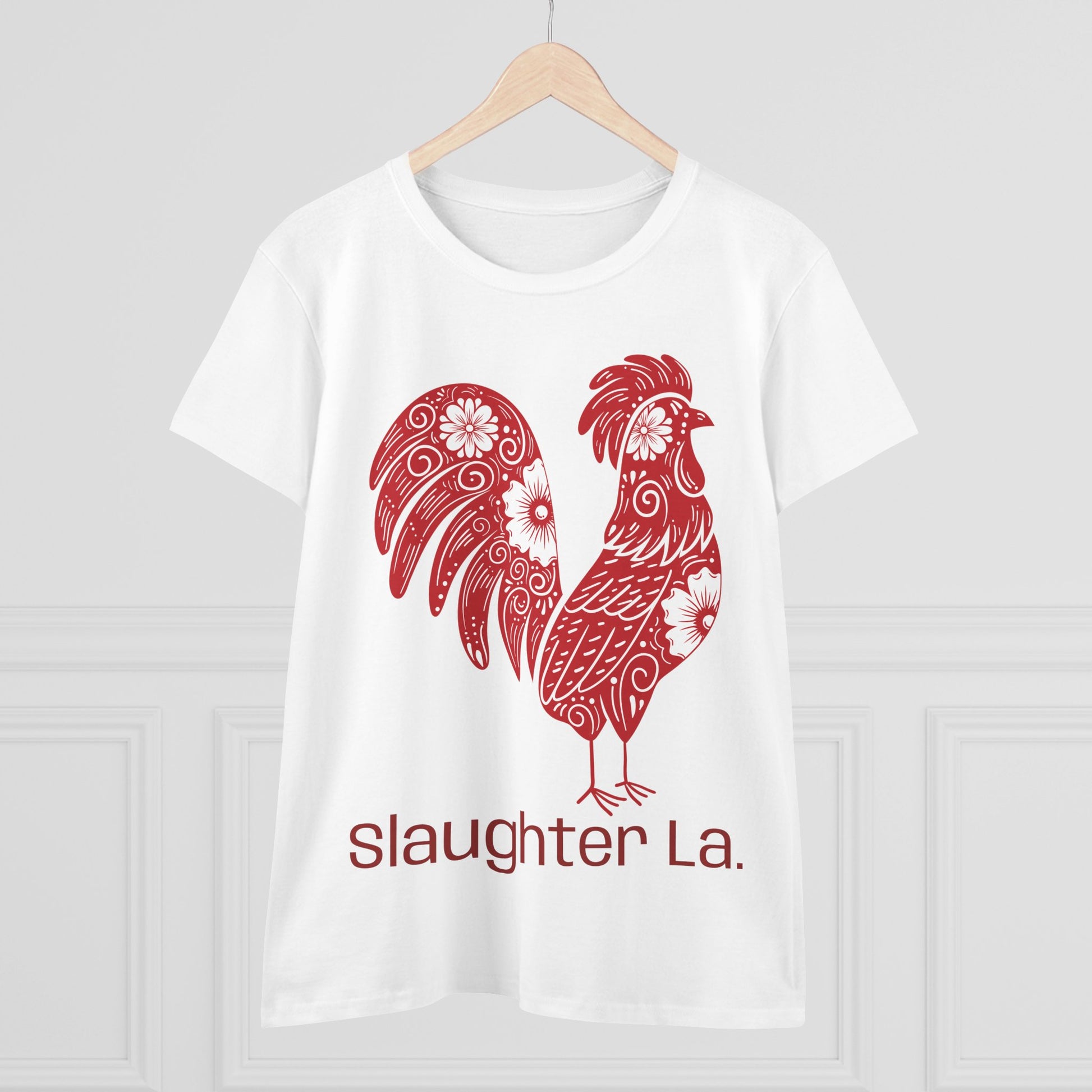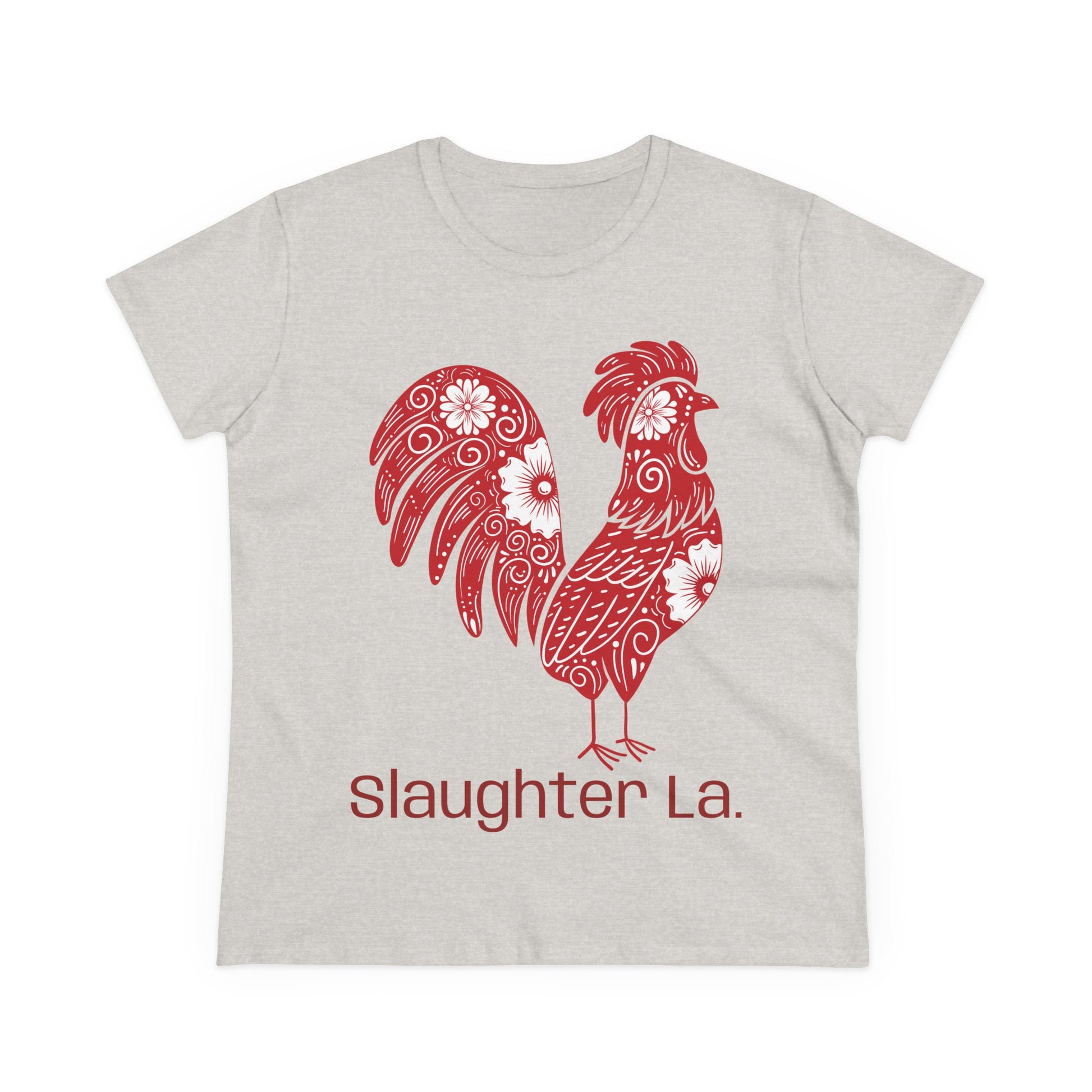 Show your love for poultry & Slaughter with this Women's Cotton Tee, perfect for layering or wearing solo. Its comfortable, semi-fitted design makes it a versatile addition to any wardrobe. The vibrant rooster design evokes a fun, artistic vibe, making it great for casual outings, festivals, or lounging at home. This tee is an excellent choice for those who appreciate individuality and it’s a thoughtful gift for friends or family! Show your Slaughter Pride & your love for animals!