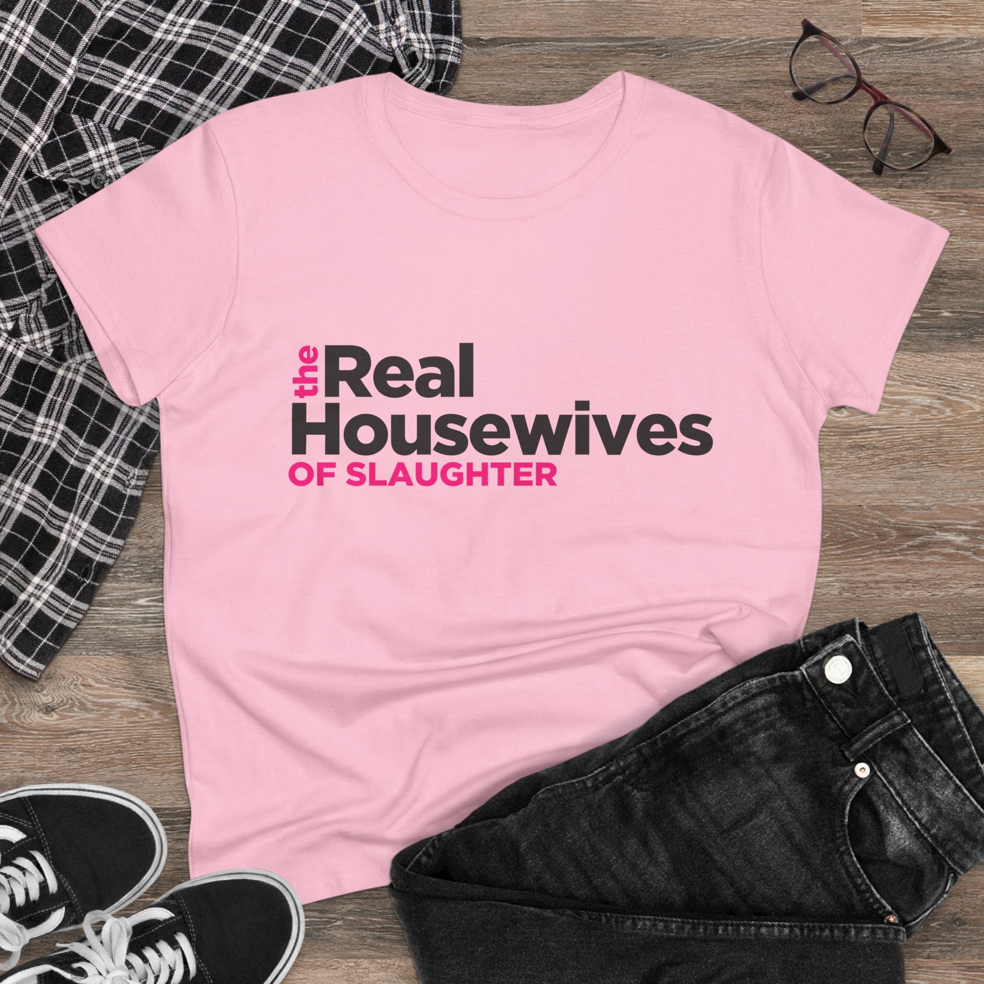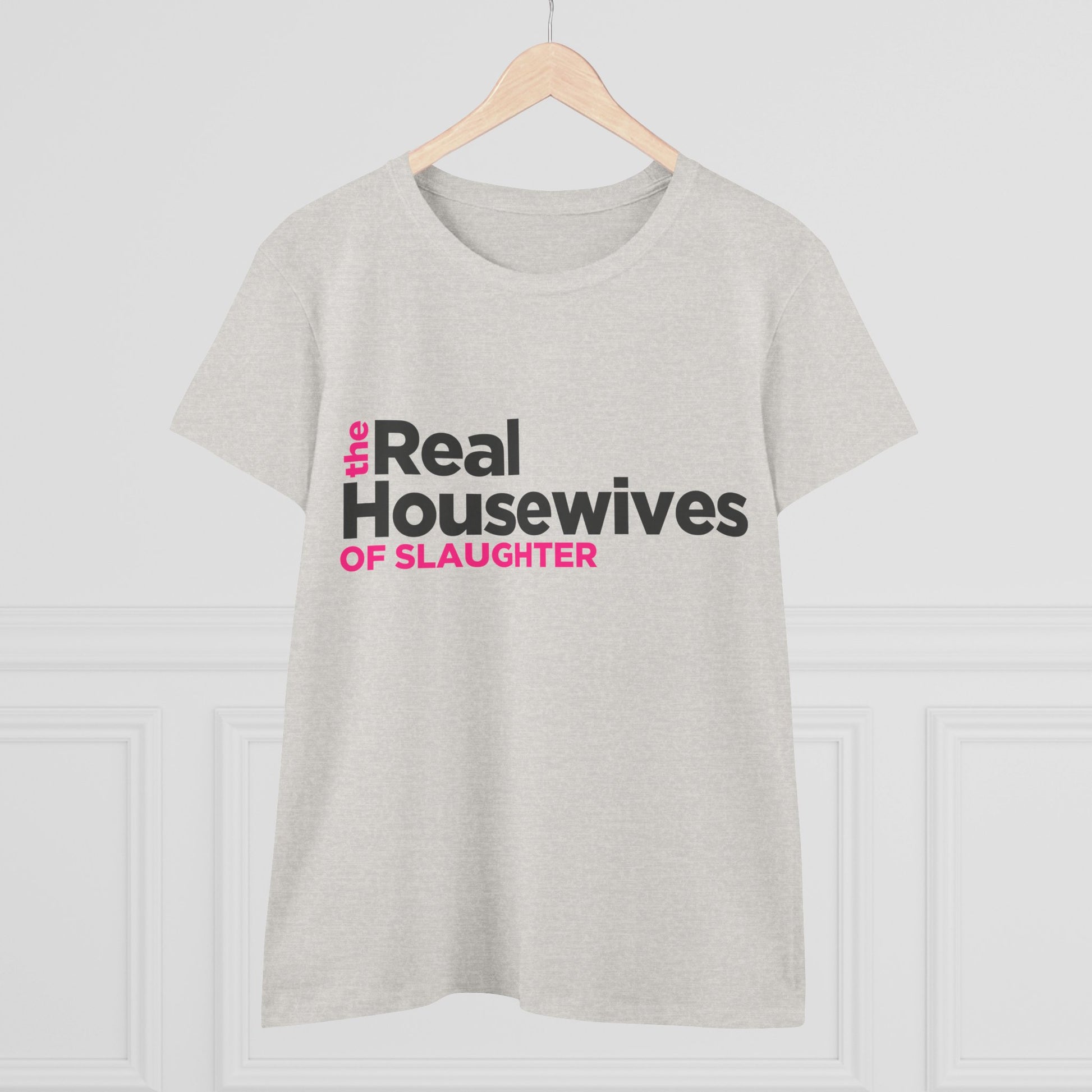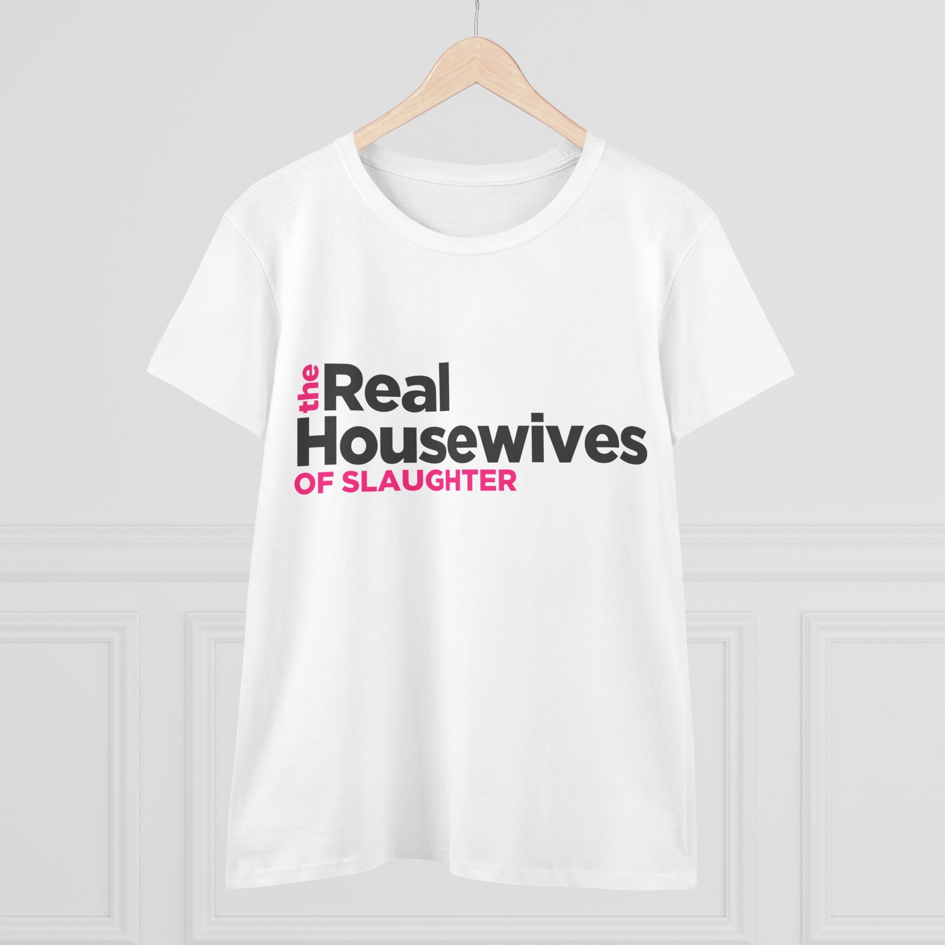 Calling all REAL HOUSEWIVES OF SLAUGHTER!! This shirt is perfect for fans of reality TV, particularly those who enjoy a humorous take on classic themes. Introducing an essential Women's Midweight Cotton Tee, perfect for expressing individuality and love for pop culture! This stylish tee, made from a blend of soft cotton and comfortable polyester, offers a semi-fitted look ideal for both lounging and outings. Whether you're binge-watching your favorite show, hanging out with friends, or running errands, it adds a fun flair to any casual outfit.